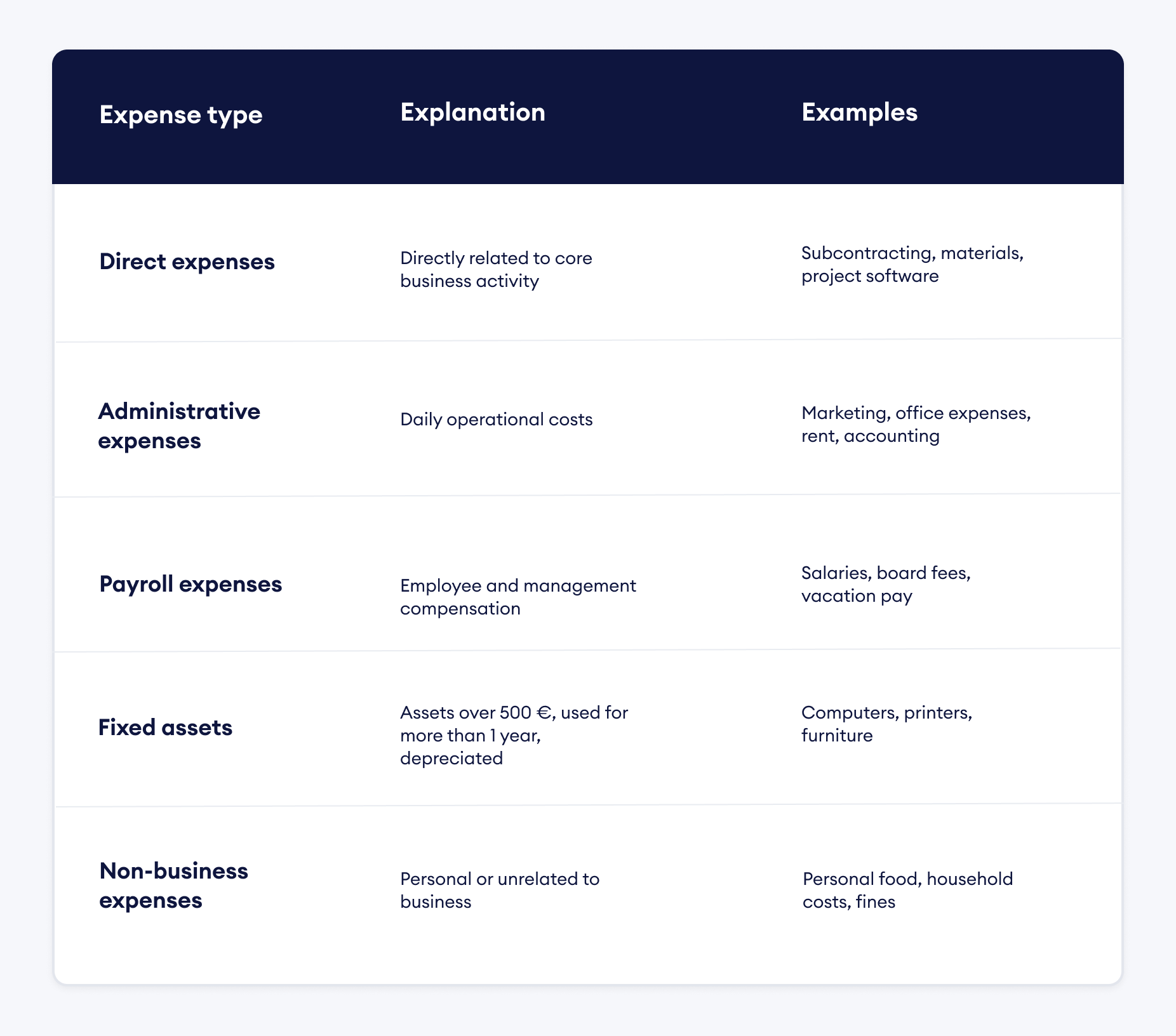 Many founders underestimate this category, especially recurring costs. Internet, mobile phone, subscriptions, utilities. They are often paid from a personal account because the contracts were signed before the company existed. Over time these “small” costs become a large part of the company’s real spending. They belong in your business expenses and, if possible, should eventually be moved under the company’s name.