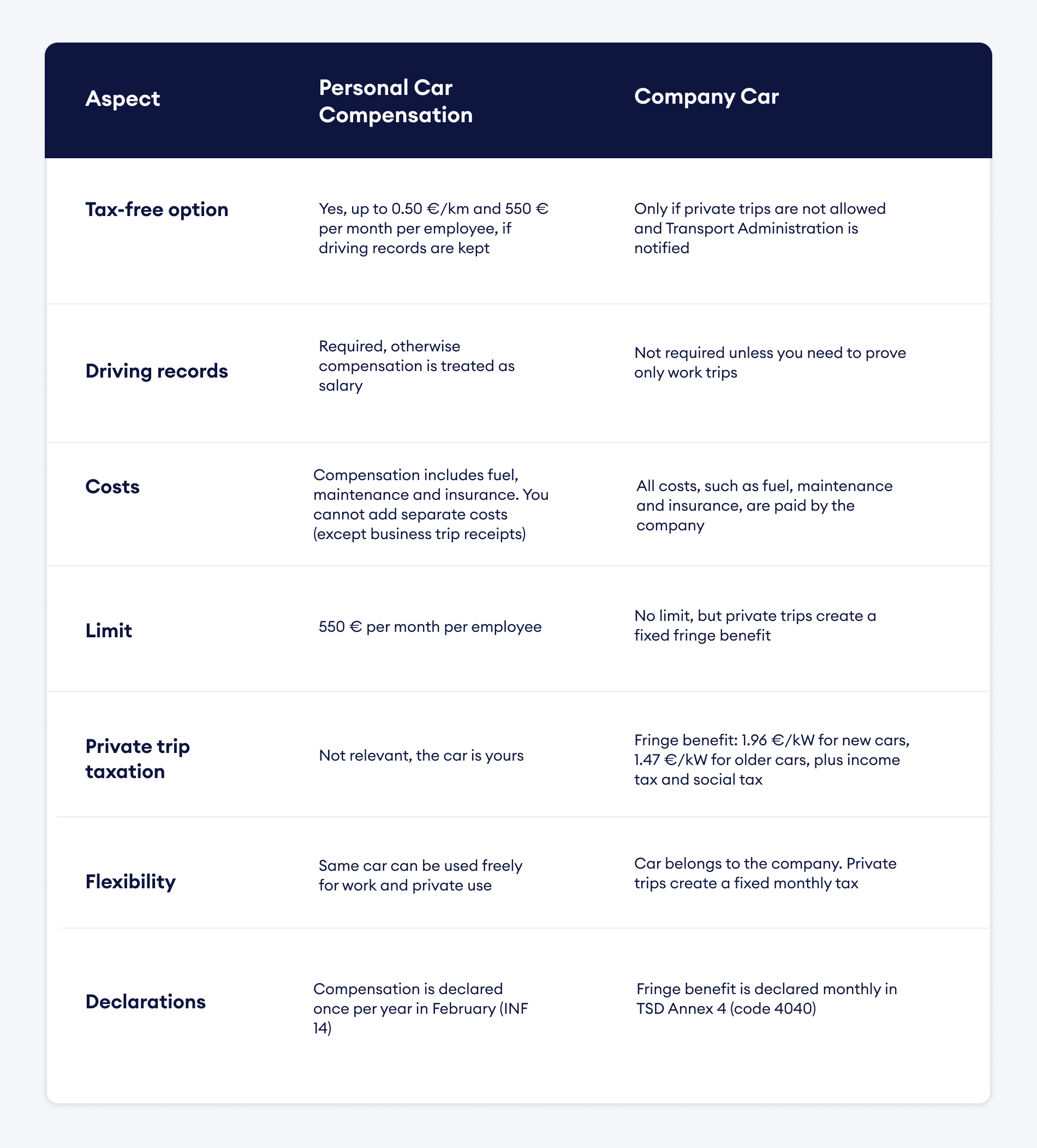 👉 Example: Same car 20 000 € + VAT (24%) = 24 800 €. If private trips are allowed, you can deduct only half of the VAT (2 400 €). The real cost is 22 400 € plus the monthly fringe benefit tax, depending on engine power.